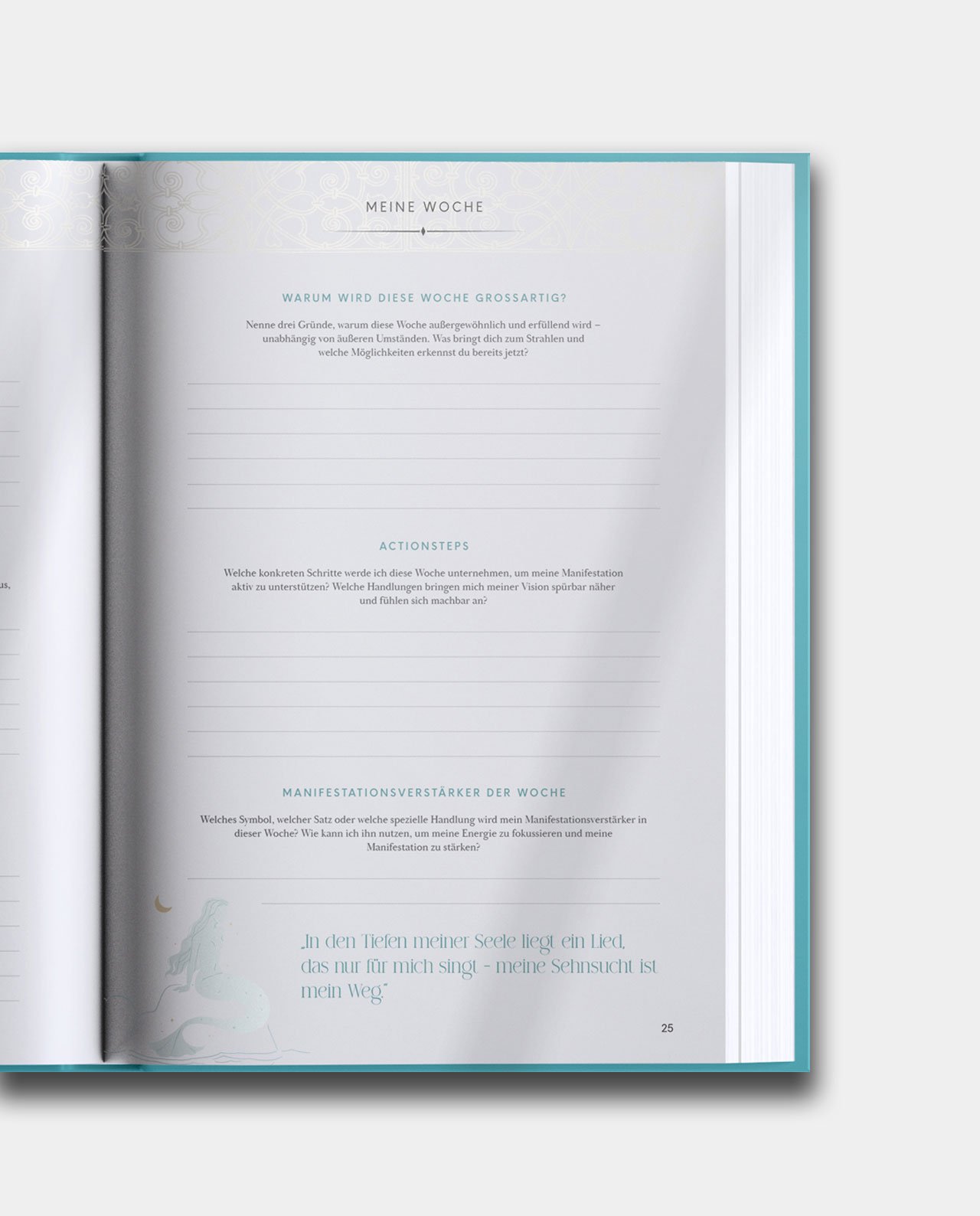 Das Mermaid Manifestation Journal übersetzt dieses Wissen in deine tägliche Praxis. Es begleitet dich über drei Monate hinweg mit inspirierenden Fragen, Reflexionen und Übungen, um das Gelernte in deinem Körper, deinem Bewusstsein und deinem Alltag lebendig werden zu lassen.